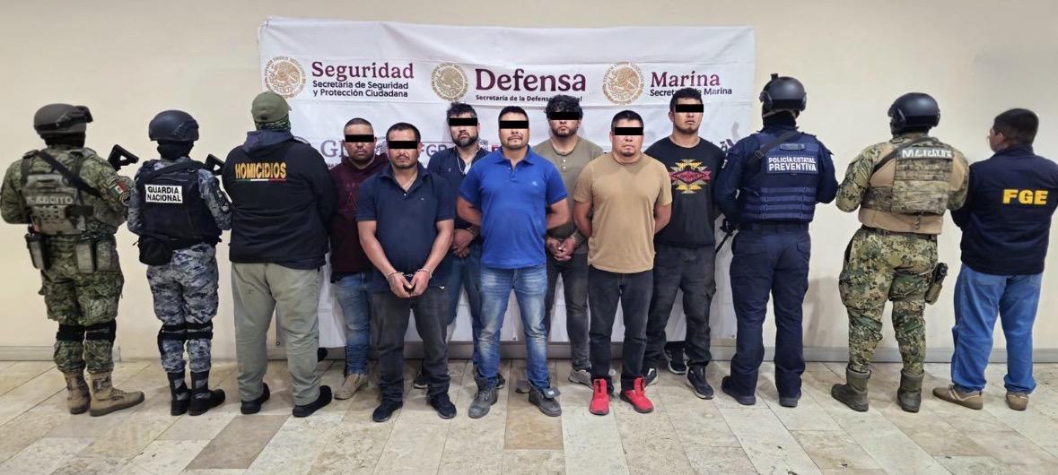 Los detenidos en esta intervención son: Roberto N., alias “El Bukanas”, quien cuenta con orden de aprehensión vigente por el delito de homicidio; Gerardo N., quien cuenta con antecedentes penales por delitos contra la salud y orden de aprehensión vigente por lesiones y robo; Saúl N., alias “El Fósil”, quien cuenta con antecedentes penales por portación de arma de fuego; Efrén N., alias “El Marañón”, quien cuenta con antecedentes por el delito de violación a la ley general de población; Juan Antonio N., alias “Charo”, así como Favián N., y Juan Carlos N.