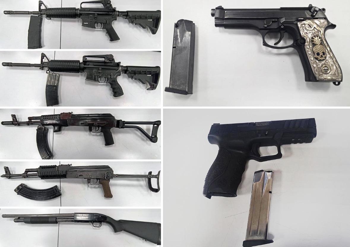 Como parte de esta intervención, fueron asegurados dos fusiles de asalto tipo AK-47, un fusil de asalto tipo AR-15, un fusil de asalto tipo Galil, una escopeta Moossberg, dos pistolas calibre 9mm, cartuchos útiles de diferentes calibres y una camioneta GMC con placas del estado de Tamaulipas.